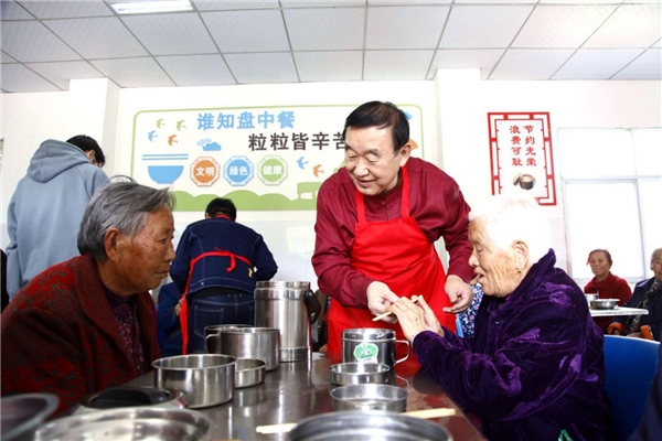 慰問演出結束后,“同心圓夢藝術團”文藝志愿者來到新崗村幸福食堂,為村里留守的孤寡老人和殘疾老人當起了“食堂服務員”,與老人們共同歡度佳節(jié);